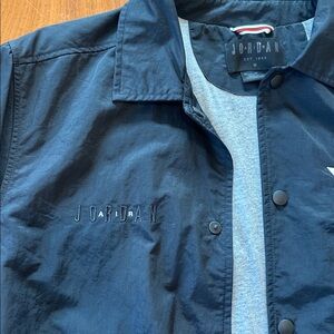 Black Jordan coaches jacket with white star detail and black on black security on back. Button-up front and elastic cuffs. Casual and stylish. Lined