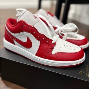 Stylish Jordan athletic shoes. Bold red and white design. Perfect for sports and casual wear.