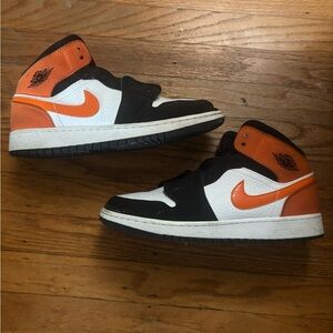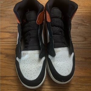 Jordan sneakers with a sleek black, vibrant orange, and crisp white design. Classic style with bold colors. Only worn like 3 times. No shoe laces or box. Size 7Y