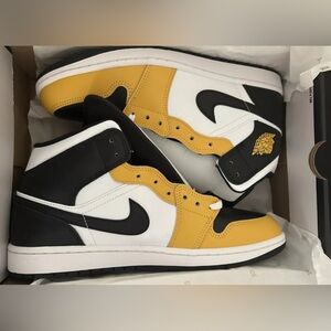 Stylish Jordan sneakers. Features black, yellow, and white design. Iconic logo on the side.