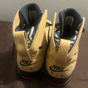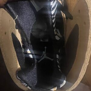Experience the perfect blend of retro and modern with these Jordan high-top sneakers. Featuring a tan and black color scheme, these shoes boast a sporty basketball silhouette with padded ankle support for comfort. The distinctive color blocking and side striping pattern make them a standout choice for any sneaker enthusiast.brand new Air Jordan Nike fits woman size 13.5