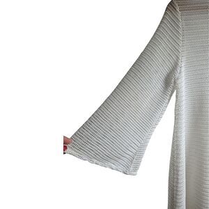 Elevate your resort look with this stunning, sheer ivory mesh tunic. The flattering V-neck and trendy bell sleeves make this the perfect effortless piece for your next cruise, beach trip, or poolside lounge. Excellent preowned condition!
