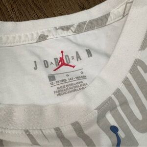 Classic Jordan tee in white with gray accents. Features a blue logo near neckline.