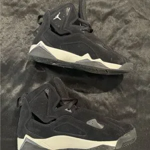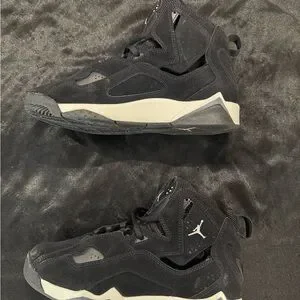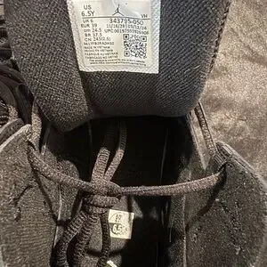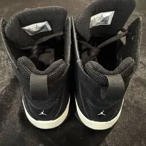 These black Jordan high-top sneakers feature a soft suede upper and a chunky rubber sole that provides excellent traction. With a rounded toe box and a stylish design, they are perfect for both athletic and casual wear.