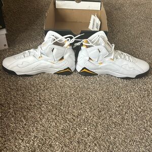 The Jordan True Flight in black, white, and yellow features a bold, high-top design with a mix of suede and leather. Its dynamic colorway and cushioned support make it a standout choice for both style and comfort.