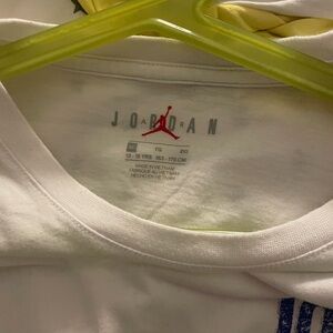Classic white long sleeve tee. Features bold blue and yellow Jordan branding. Ideal for casual wear.