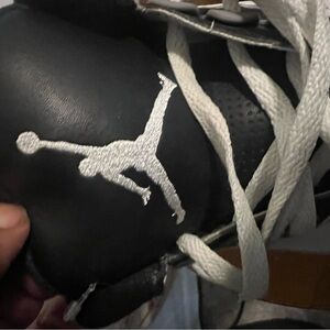 Classic Jordan sneakers in white and black. Features red accents and unique pattern details. Ideal for casual wear.sneakers have been authenticated