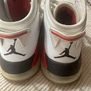 Stylish Jordan athletic shoes. Features white leather with red accents. Comfortable and durable design.