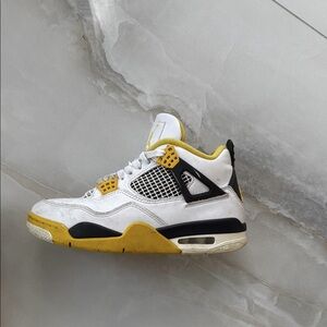 Experience the perfect blend of style and comfort with these Jordan sneakers, featuring a white leather base accented by vibrant yellow highlights. The design includes a distinctive midsole with visible Air cushioning for superior support, while the classic AJ4 elements like wing eyelets and technical mesh details add a touch of iconic flair.