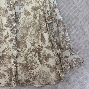 Jordan Womens L Blouse Beige Floral Button Up 3/4 Sleeve Ruffle Lined Chiffon