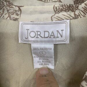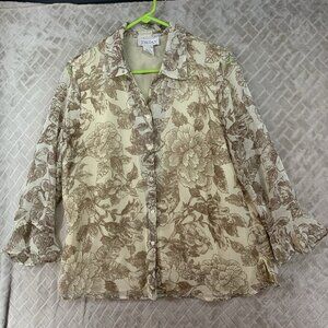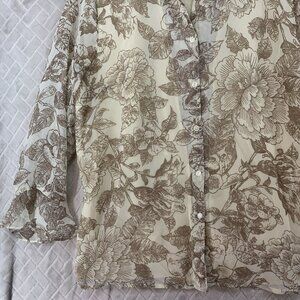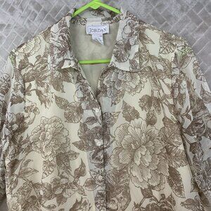 Jordan Womens L Blouse Beige Floral Button Up 3/4 Sleeve Ruffle Lined Chiffon. No stains or holes.