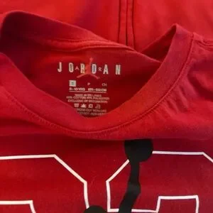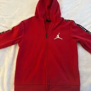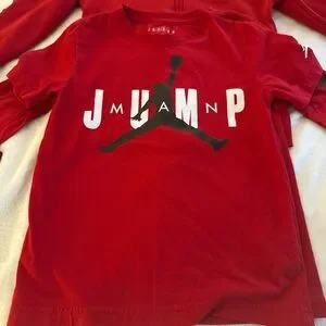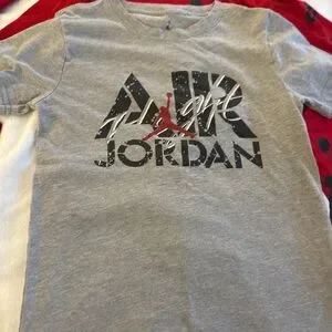 Jordan apparel featuring the iconic Jumpman logo. Stylish gray t-shirt, red t-shirt, full zip hoodie, and long sleeve t-shirt All are size 8/10 in kids