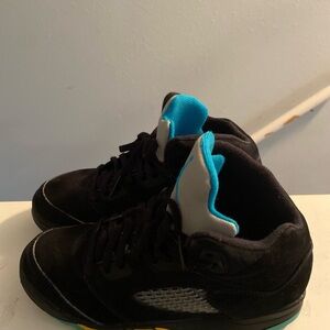 Stylish Jordan sneakers for kids. Black body with teal accents. Comfortable and trendy.