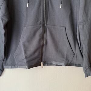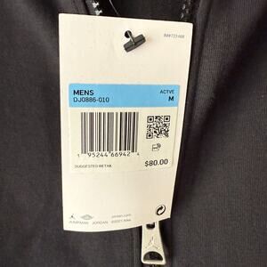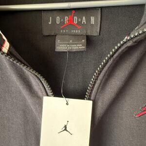 This is a new with tags Jordan full-zip hoodie, model DJ0886-010, size M. The hoodie is black and features a red Jordan logo on the chest. It has a drawstring hood and two front pockets. The body is made of 81% cotton and 19% polyester. The pocket bag is 100% cotton. The suggested retail price is $80.00. The hoodie is in excellent condition with no visible imperfections.
