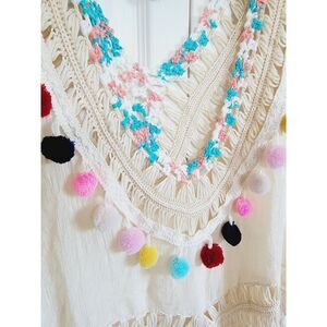 Joress M Oversized Southwest Top Hippie Pompom Low Cut Gauze Tan Tassels SS