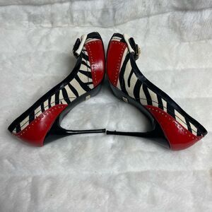 Jorge Bishoff Red patent leather,black white stripes textile peep toe heels embellished with a black and white bow gold tone studs and accent EUR SZ37. Pre owned in good used condition normal wear see all pictures any questions please message.