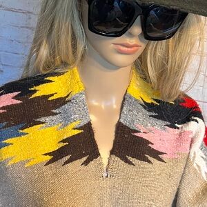 Stylish poncho with vibrant patterns. Features red, yellow, and black accents. Thick woven fabric in beautiful colors measures 38"x72" with fringe trim. Gorgeous equestrian attire, ranch attire. Rug pincho, jorango.