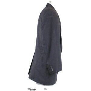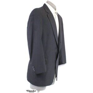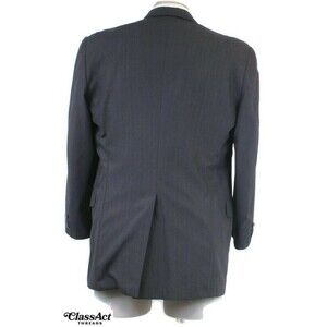 This Jos. A. Bank 2 Piece Suit for men in black striped wool features a three-button jacket with a pleated front and single-breasted design. It has a classic notch lapel, single vented back, and comes in a size 42L with a 32" waist. The suit is perfect for formal occasions, weddings, parties, or business events, and it is designed to fit in a regular style. With its vintage look and high-quality material, this suit exudes a timeless and sophisticated charm, making it a versatile and stylish addition to any man's wardrobe.