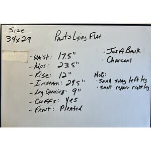 Look sharp and make a statement in this Jos A Bank 2 Piece Suit that is perfect for any occasion, whether it's a business meeting, wedding, party, or just a casual day out. The jacket features a notch lapel style, single-vented jacket vent style, and two-button front button style. The pants have a pleated front type and a straight leg style with cuffed hem. The suit is made of high-quality wool material - note there is a very small snag on one leg and a very small repair on the other.