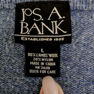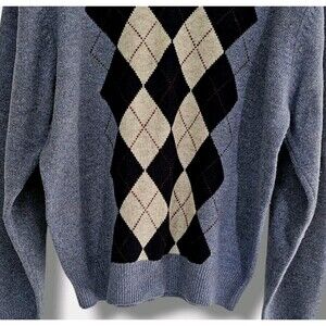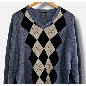 Jos A Bank Argyle sweater in a men's size large. Lambs Wool blend, blue and cream, long sleeve, v-neck. Very good pre-owned condition with no noted flaws.