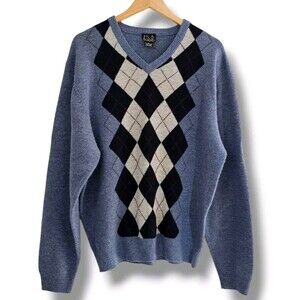 Jos A Bank Argyle Sweater Lambs Wool Mens L Blue Cream Academia Preppy Old Money