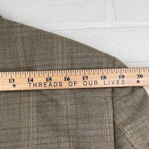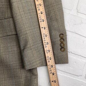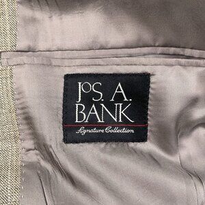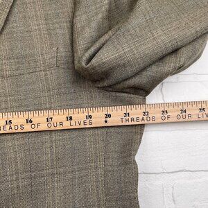 Jos A Bank offers a stylish 41R green plaid Gordon Signature jacket. Crafted from an exquisite blend of wool, silk, acetate, and Bemberg, it showcases classic tailoring in a rich olive green, blue, tan, beige, and brown palette.