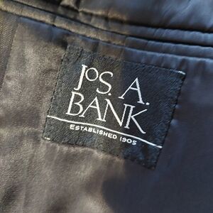 Sophisticated charcoal gray suit by Jos. A. Bank. Ideal for formal events. Offers a sleek and modern fit.