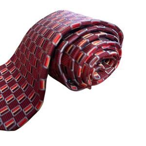 This Jos. A. Bank silk tie is a dark red, textured piece made in Italy. It is a geometric-patterned XL extra-long tie measuring 3.5 inches wide and 62 inches long, suitable for men. The tie features a classic width, a pointed style, and is adjustable for convenience. It is a high-quality accessory that adds a touch of sophistication to any formal ensemble.