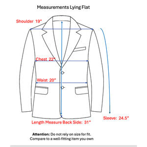 Size Disclaimer: Do not rely on the size tag as suits can be altered or customized. Please compare the measurements to an item you own before ordering. Thank you for your help!