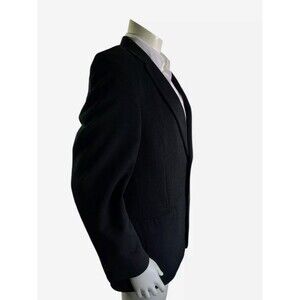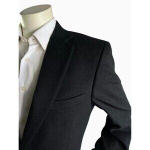 The Jos A Bank Mens 42R Camel Hair Blazer Traveler's Collection Tailored Fit Jacket is a classic and designer sport coat perfect for travel occasions. This two-button single-breasted blazer features a solid black color with a notch lapel style, offering a tailored fit for a sophisticated look. Made with high-quality camel material, this blazer exudes a timeless and stylish appeal, making it a versatile piece for any man's wardrobe.