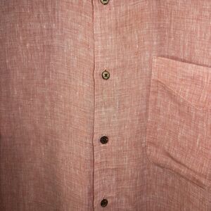 This product is a stylish and versatile Jos. A. Bank men's linen short sleeve button-up shirt in a peachy orange color. The shirt features a collared neckline, wooden buttons, and a spread collar style for a classic look. Made from woven 100% linen fabric, it is machine washable and easy to care for. The shirt is suitable for various occasions such as travel, parties, or casual wear, and it comes in size M with a regular fit. Additionally, it has a pocket accent and is an ideal choice for all seasons.