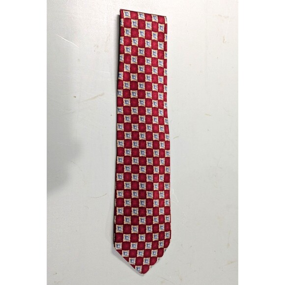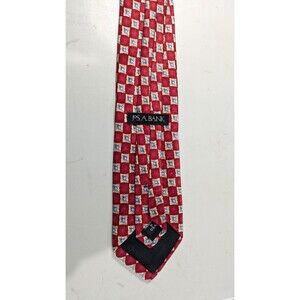 The product is a men's silk necktie from Jos. A. Bank in a classic geometric pattern featuring red, white, blue, and gold colors. Made from 100% silk with a woven fabric type, this designer tie has a classic length of 57"-60" and a classic width. It is a stylish and high-quality accessory for men, perfect for adding a touch of sophistication to any formal or professional outfit. Made in the United States, this tie embodies a timeless and elegant style that is sure to make a statement.