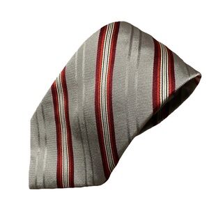 Classic Repp striped tie from Jos A Bank Made in Italy. In fantastic condition. 100% silk. 3.5” wide; 58” long. Silver gray with red, maroon, black and white stripes.