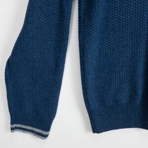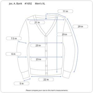 Men’s XL Jos. A. Bank shawl collar sweater in navy blue. Slimmer fit—check measurements. Ribbed texture throughout with contrast stripe cuffs and a structured button neckline. Soft Merino wool blend provides warmth without bulk.