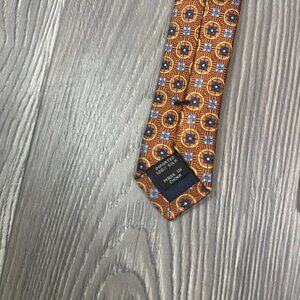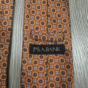 Ships fast from North Carolina! Classic Jos. A. Bank silk tie in orange with a refined yellow and blue geometric pattern. This timeless accessory is perfect for work, weddings, or special occasions.