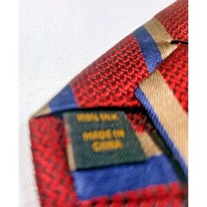 * Pattern: Diagonal stripe in red, navy blue, and gold/tan