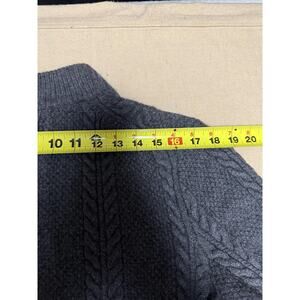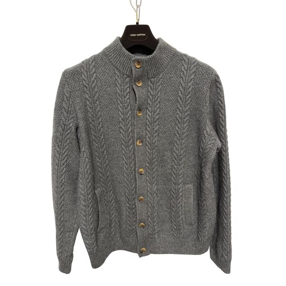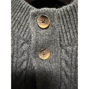 Design details: Mock neck with ribbed trim, full button front with marbled buttons, front slip pockets, allover cable knit texture, ribbed cuffs and hem, suede-style elbow patches, and spare button attached to interior care tag.