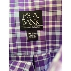 Jos. A. Banks short sleeve shirt in size Large. It is the Traveler series in a purple and blue plaid pattern. 100% cotton. Left chest front pocket.