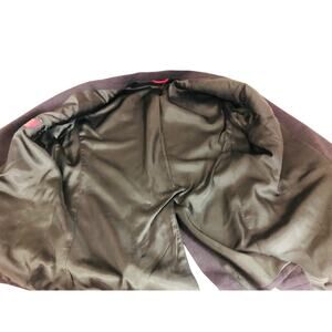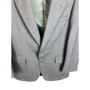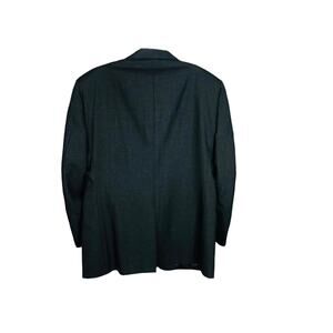 This solid black blazer is a one piece suit that comes in a regular fit, size 43R. It is perfect for all seasons, including winter, summer, fall, and spring. The jacket length is regular, making it suitable for all body types. This pre-owned sport coat is in excellent condition and will surely add a touch of sophistication to your wardrobe.