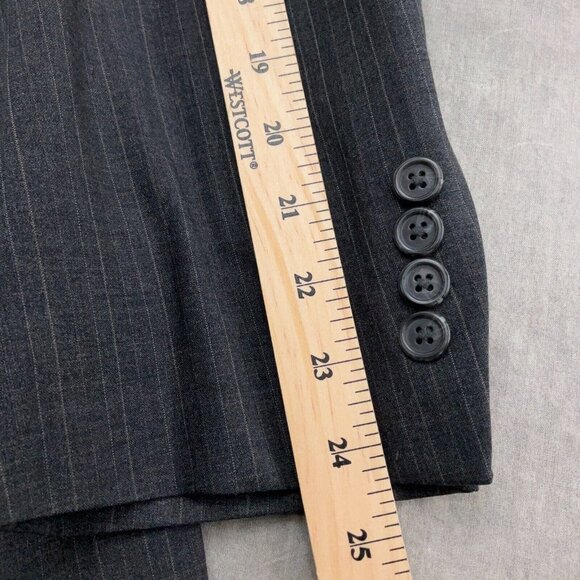 A timeless Jos. A. Bank suit for men, size 41R 35Wx29L, in a classic gray tan pinstripe. Perfect for a professional career or any formal event. Made from high-quality wool, this vintage 2-piece is a must-have for any wardrobe.
