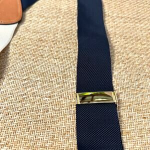 Jos. A. Bank suspenders/braces in navy grosgrain-style fabric with black leather button-on ends and cross patch. Features gold-tone hardware adjusters stamped Jos A Bank. Classic menswear accessory with a clean, tailored look. Lightly worn, overall excellent condition.