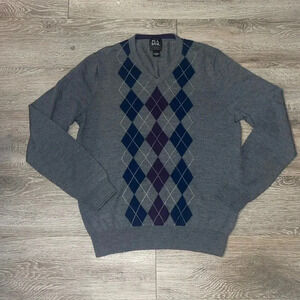 Jos A Bank Sweater Mens Large Gray navy Wool Argyle V-Neck Preppy Academia Knit