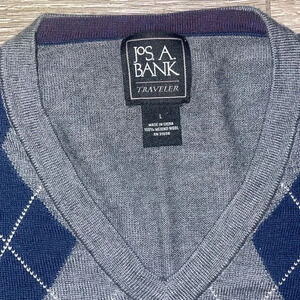 Jos A Bank Sweater Mens Large Gray navy Wool Argyle V-Neck Preppy Academia Knit
