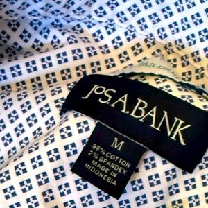 Sharp and versatile, this Jos. A. Bank tailored-fit shirt features a blue and white geometric microprint on soft stretch cotton. Long sleeves, button-down collar, and a crisp modern fit make it perfect for business casual, dinners out, or everyday polish. Size Medium. Excellent condition with no flaws.