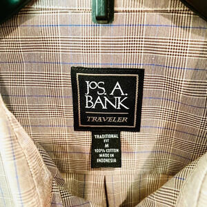 Jos. A. Bank Traveler button down 100% cotton shirt, long sleeve, tiny houndstooth plaid pattern, traditional fit, breast pocket.