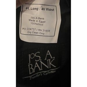 This is a Jos. A. Bank Travelers Collection Tailored Fit Jacket for men in size 46L/40W. The jacket is in a blue-gray color with a regular length and tailored fit. It features a two-button front closure and is suitable for various occasions such as travel, weddings, parties, formal events, and business settings. The garment should be dry cleaned only and is made in Egypt, suitable for all seasons.