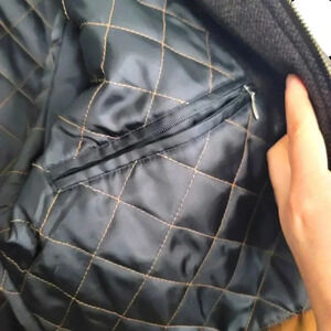 The coat is a size M with a chest size of 46 in and a regular fit. It is a solid color with button and zipper accents. This designer coat has a classic and contemporary theme and is perfect for walking and other activities. The front exterior has four pockets and two of which that zip up. The interior has three pockets that zip up. The coat is pre-owned but is in excellent condition. The main zipper pull has been replaced and functions as the original.