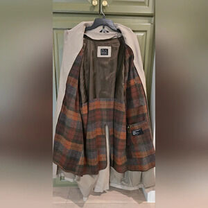 size 42S, gently worn beige colored trench coat with wool removable lining for extra warmth. Great condition.