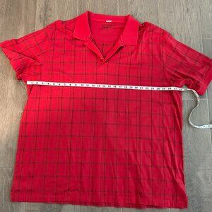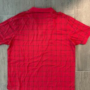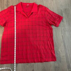 The Jos A Bank Leadbetter Golf Shirt in size 3XL is a pre-owned red polo shirt made from 100% cotton fabric. It features a check pattern, collared neckline with a button-down collar style, and short sleeves. This shirt is suitable for activewear and casual occasions, perfect for golf enthusiasts looking for comfortable and stylish clothing. The garment care instructions recommend machine washing, making it convenient for regular wear. With a chest size of 28 inches, and measuring 33" from shoulder to hem, this big and tall shirt from the renowned brand Jos. A. Bank is ideal for those who enjoy golfing and need a quality and durable shirt for their active lifestyle.