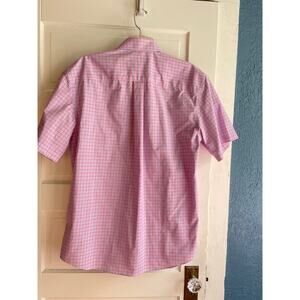 Jos. A. Bank short sleeve shirt in size Large. It is the Traveler series in a soft pink and blue plaid pattern. 100% cotton. Left chest front pocket.